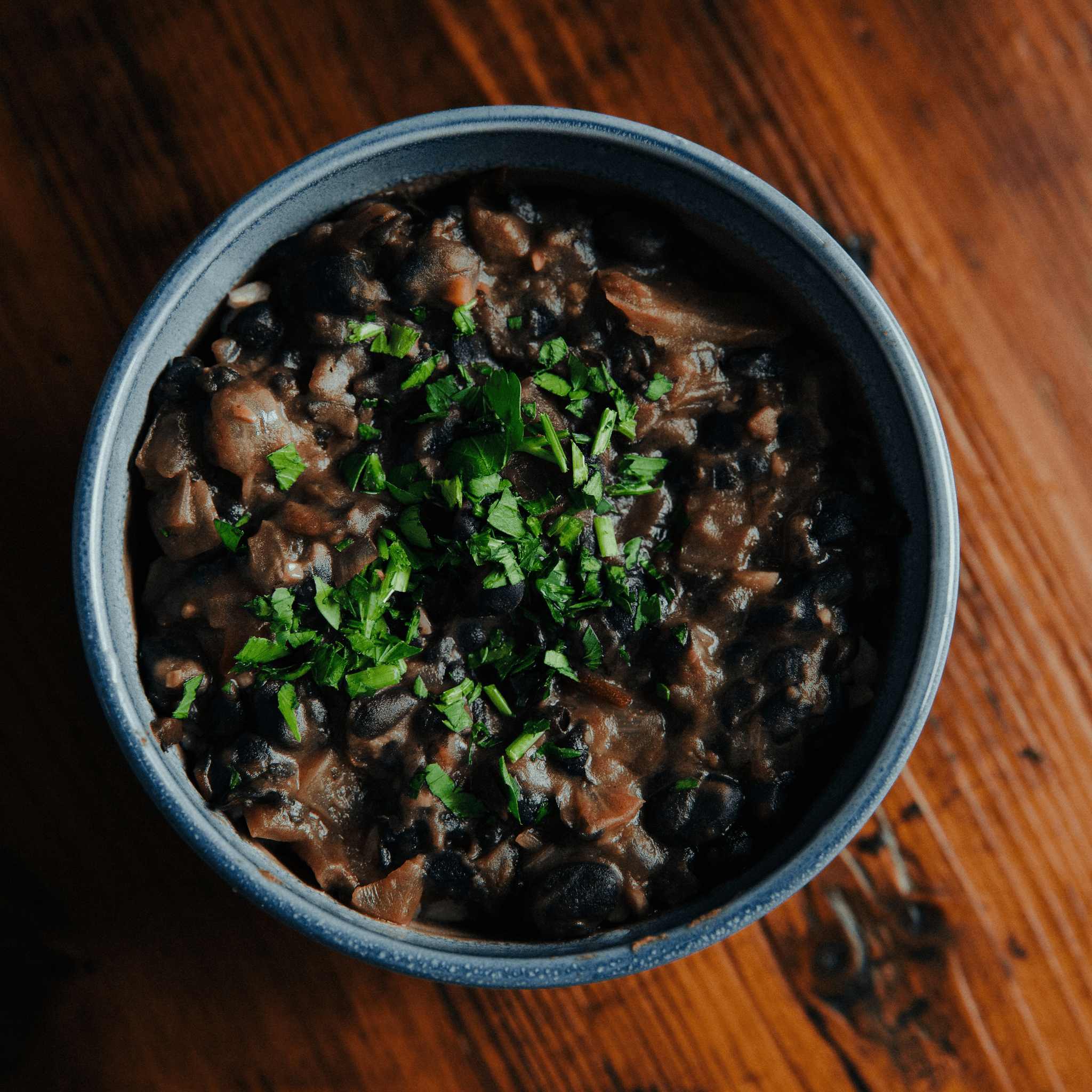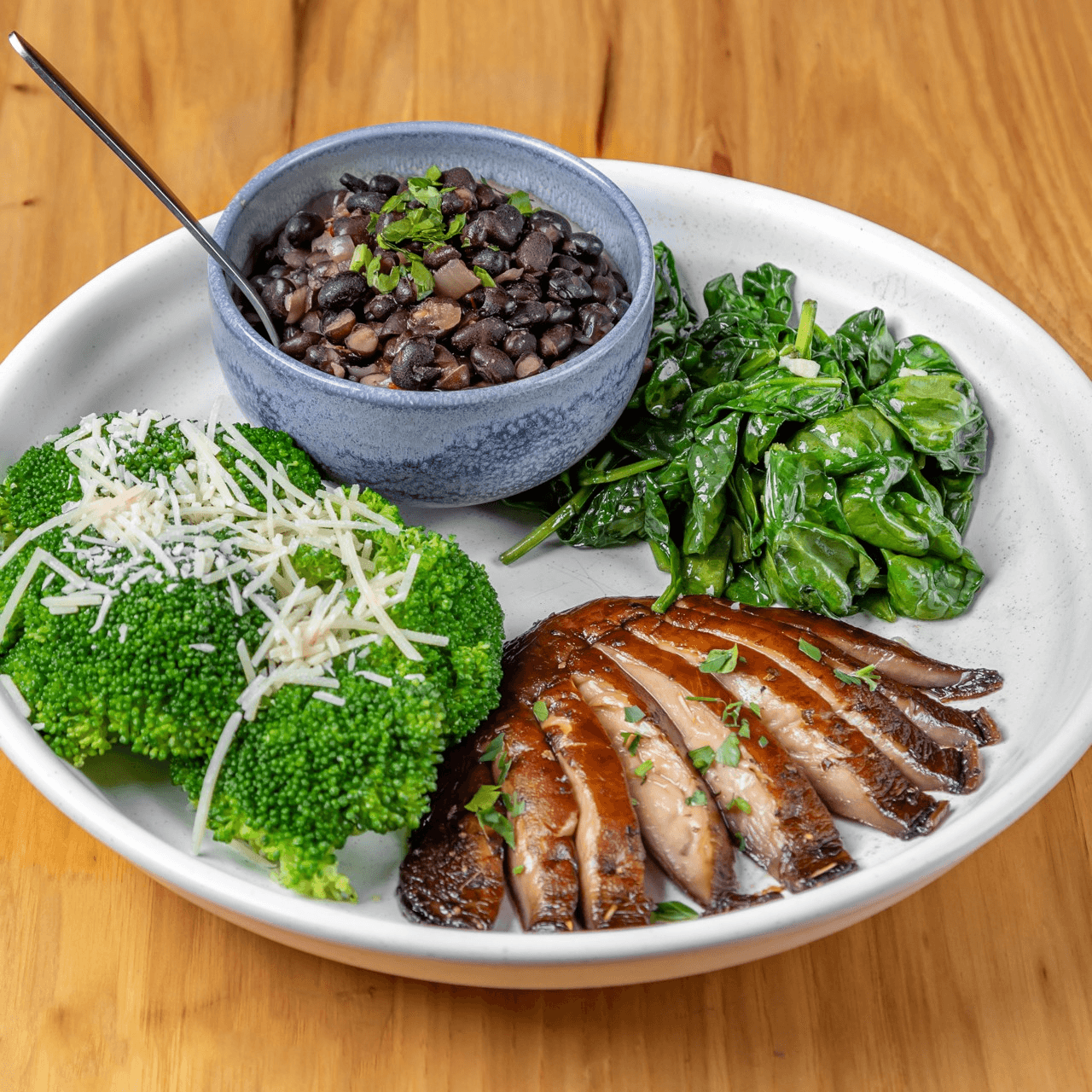 grilled portobello mushroom, garlic spinach, hill country black beans and brown rice, parmesan broccoli