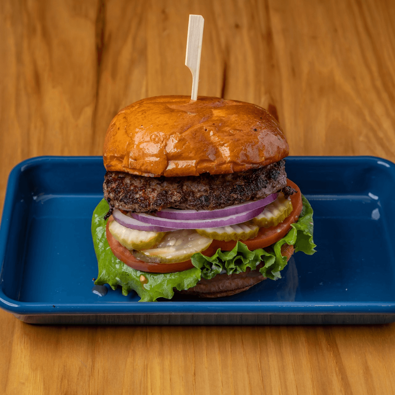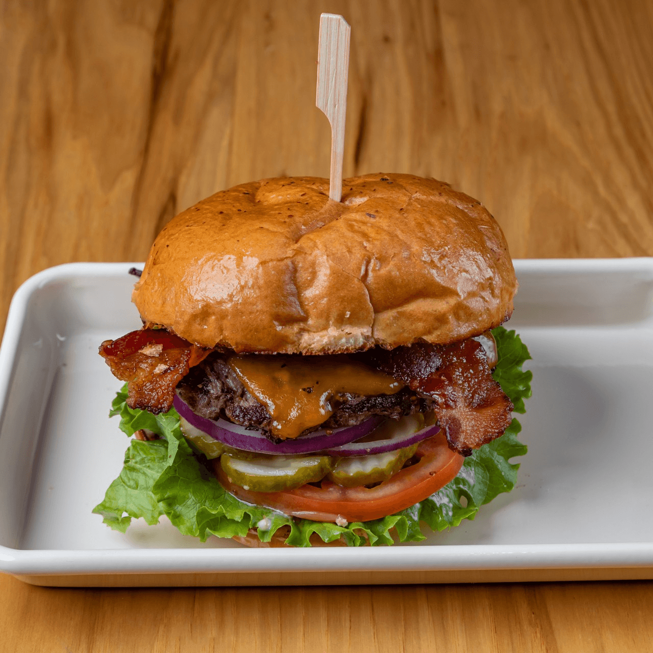 dr. pepper BBQ, cheddar, bacon, griddled onion, pickle, house mayo, lettuce, tomato