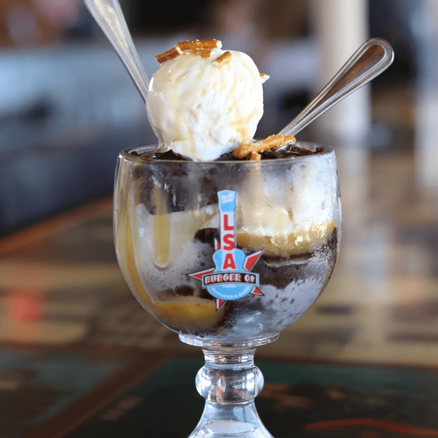 double fudge callebaut brownie, Beth Marie's vanilla bean ice cream, toasted pecan