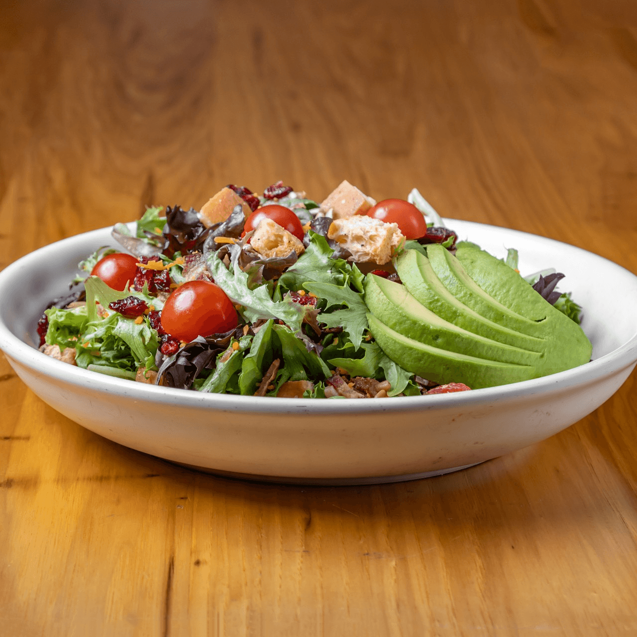 spring mix, spinach, cherry tomato, cheddar cheese, bacon, avocado, brioche croutons, cranberries, sunflower seeds, choice of dressing