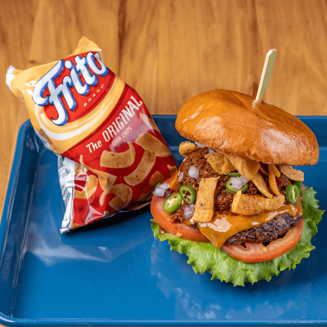 texas chili, fritos, cheddar, onion, mayo, lettuce, tomato